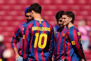 巴萨球员赛前身穿罗纳尔迪尼奥的球衣踩场,向这位巴萨传奇球星致敬,因为昨天是罗纳尔迪尼奥的46岁生日。